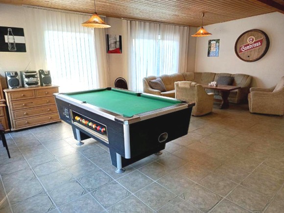 Sie verfügt über einen Essraum mit Bar und TV, Gemeinschaftsraum mit Billard, Tischfußball, Darts, Kinderspielecke, Außenpool, Terrasse mit Kamin und Räucherkammer, Aufbewahrungsraum für Fahrräder und Ski und Fahrradverleih.